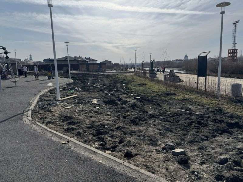 Возможно, все эти недостатки будут устранены... Пишем «возможно», ведь в зоне видимости нет ни одного информационного стенда о том, что вообще происходит в местах, где кое-как установлены объекты. Например, здесь лежат мешки с неизвестным содержимым - возможно, в них чернозем для газона, а, возможно, песок, чтобы набережная не уплыла после весны. Это тайна.