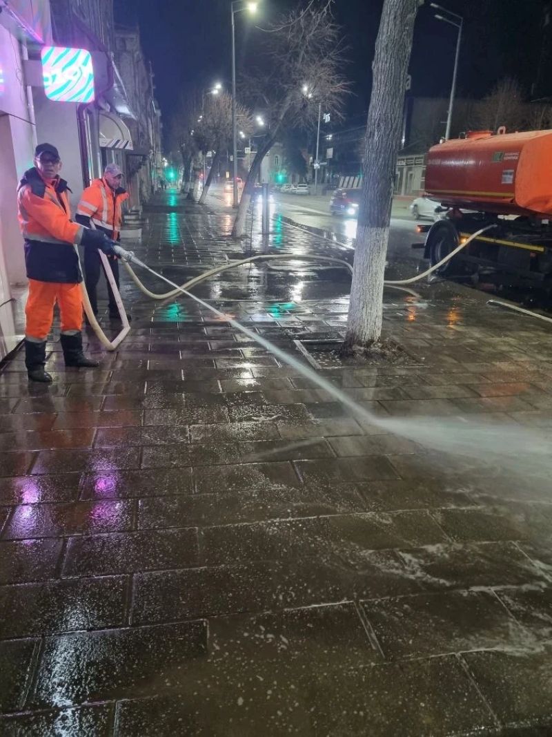 Ночью на улице Советской высадился десант коммунальщиков. Сотрудники МКУ «Благоустройство» приступили к помывке тротуаров на центральной улице города. Критику на тему загрязнённых пылью пешеходных зон услышали и ускорили процесс по наведению чистоты в центре города. Работы, как заявили в Комитете ЖКХ, проводились ночью для максимального эффекта. Накануне горожан попросили убрать личный транспорт с дороги для проведения работ и подъезда коммунальной техники вплотную к бордюрам. Как видно, промывали брусчатку центральной улицы с помощью шлангов. Под напором воды с брусчатки смывалась накопившаяся пыль и песок, которым зимой обрабатывали тротуары от гололеда.