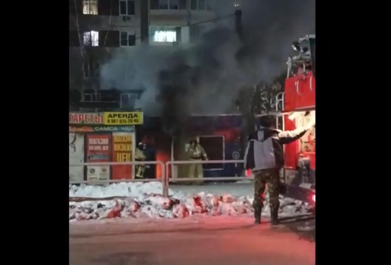 дверь киоска, черный дым повалил густым столбом. На видео видно, что внутри киоска бушует пламя.