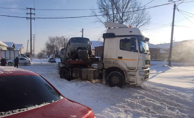 На улице Урицкого в Сызрани, в районе пересечения с улицей Красноармейской, дорогу перекрыл неудачно разворачивавшийся Камаз. Большегруз с полуприцепом-платформой перевозил автомобили УАЗ. На перекрестке водитель решил развернуться, но завершить маневр не смог и перегородил проезд по улице Урицкого, оставив для остальных автомобилистов лишь небольшой прогал, где можно проехать, и то придется зацепить сугроб. Как долго большегруз будет выбираться из западни, неизвестно, так что водителям стоит поискать пути объезда.