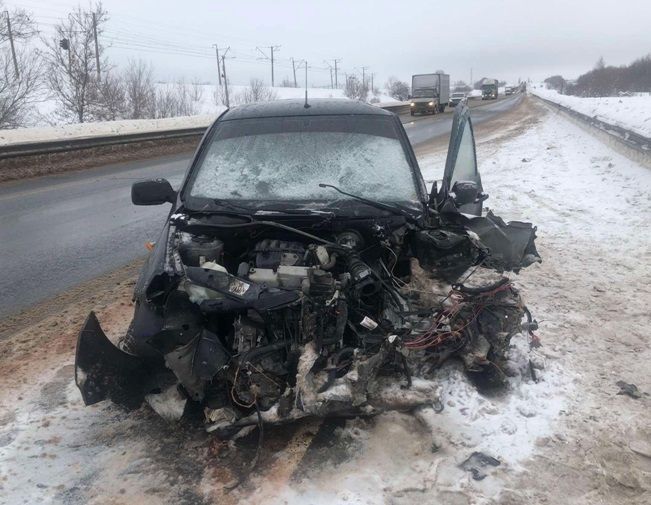В субботу, 19 февраля, на 922 км автодороги М-5, произошло столкновение легкового автомобиля и большегруза. По информации ГУ МВД России по Самарской области, 45-летний водитель, управляя автомобилем Гранта, ехал по трассе со стороны Сызрани в направлении Тольятти. На подъезде к селу Печерское он не справился с управлением, выехал на встречную полосу дороги, где совершил столкновение с большегрузом Volvo под управлением 44-летнего водителя, идущим навстречу по своей полосе. В результате ДТП водитель легкового автомобиля госпитализирован. Легковой автомобиль разбит - вся передняя часть превратилась в сплошное месиво.