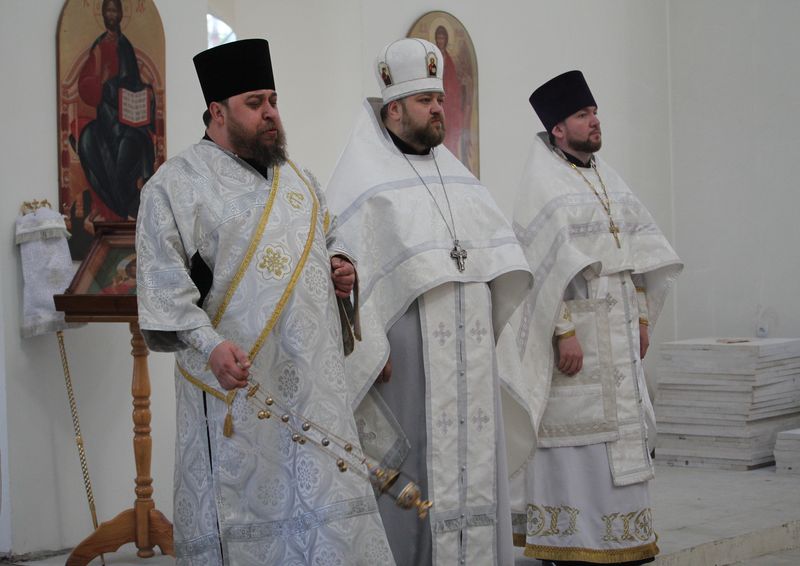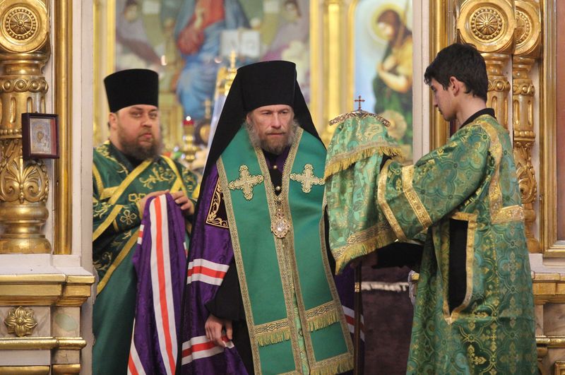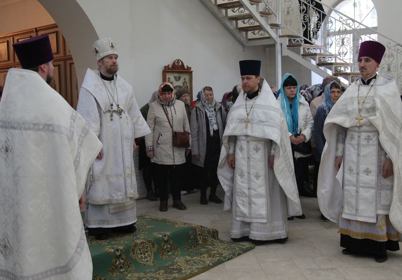 Епископ Леонтий совершил Божественную литургию в Троицком храме, а затем освятил вербные и пальмовые ветви в Казанском соборе