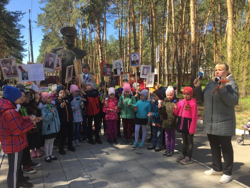 позже, когда ребята, в сопровождении родителей и педагогов Татьяны Камсковой и Светланы Мальцевой, с цветами и портретами воинов в руках, под музыку военных лет, направились к