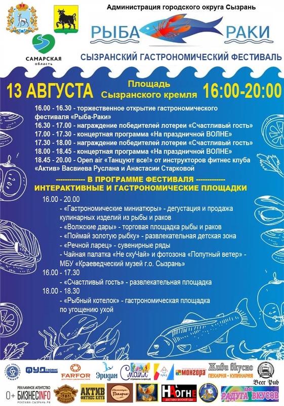 В субботу, 13 августа, в 16 часов в Сызрани стартует гастрономический фестиваль «Рыба-Раки»(0+). На площади у Спасской башни городского кремля будут чередовать друг друга концертные номера программы «На праздничной ВОЛНЕ», поздравления, награждения победителей лотереи «Счастливый гость» и дегустация кулинарных блюд из рыбы, раков, морепродуктов и т.д.. В течение четырех часов гостям фестиваля предложат купить и продегустировать рыбные деликатесы. В программе описано подробно, как будет проходить фестиваль. Будут работать гастрономические и интерактивные площадки, к 18 часам