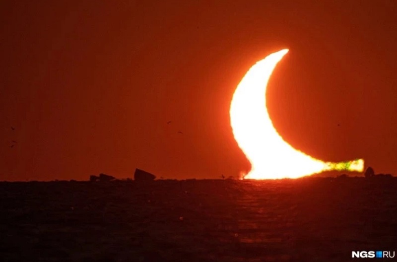 На большей части земного шара сегодня можно было наблюдать солнечное затмение. Не полное, частичное, но оно оказалось довольно продолжительным, так что земляне, в том числе и граждане России, с удовольствием ловили моменты уникального астрономического явления на камеры. По интернету можно найти много видео и фото этого затмения. Некоторые кадры в буквальном смысле поражают. Невероятно повезло жителям азиатской части России. Так, новосибирцы смогли рассмотреть заход небесного светила во всей красе. На закате Солнце, перекрытое диском Луны почти на 70%, превратилось в красный месяц, который плавно ушел за горизонт.