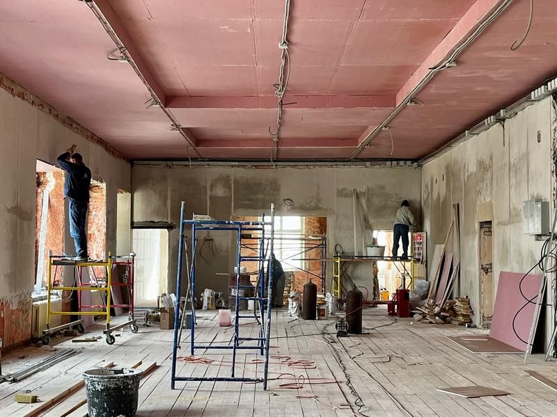 Уже выполнена подшивка потолков, продолжаются штукатурные работы, ремонт кровли. Поэтапно специалисты меняют инженерные коммуникации: наружные и внутренние. Деревянные окна заменили на стеклопакеты. Кроме того, будет установлен и оснащен современным оборудованием пункт охраны.