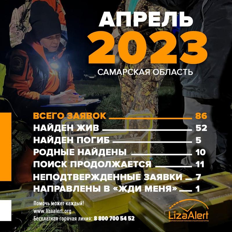 Пять человек погибли в Самарской области в апреле, не дождавшись помощи: помощники не успели найти их. В группе поисковиков «Лиза Алерт» в Самарской области сообщили о том, как работали добровольцы в апреле 2023 года. В группу поиска поступило 86 заявок о без вести пропавших земляках. 52 человека были найдены живыми, и в их числе - 3-летний малыш из села Большая Каменка. Напомним, пропавшего ребенка искали почти 400 человек. Мальчик Ваня приехал на выходные в деревню с семьей. Никто не ждал беды. Но случилось так, что мальчик уехал в неизвестном направлении на детском беговеле, в сопровождении собаки. Сначала родственники искали малыша своими силами. И только после 21:00 родственники обратились в группу «Лиза Алерт».