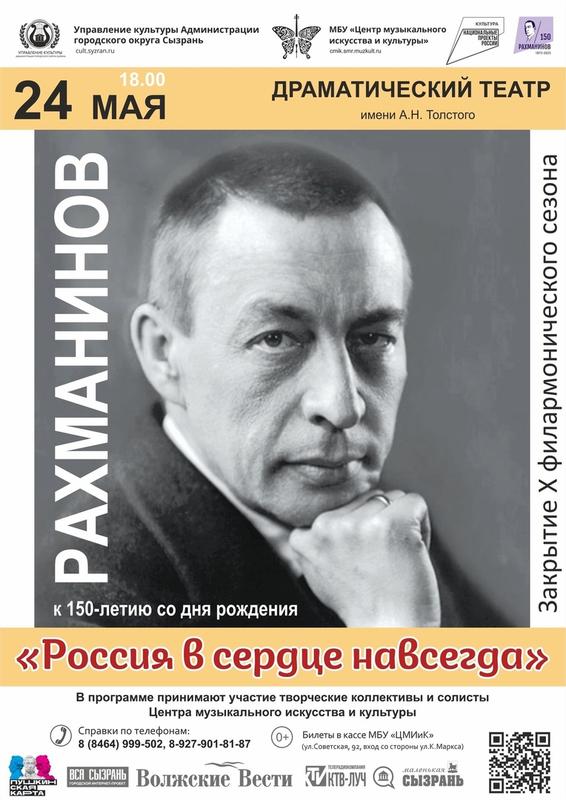 В среду, 24 мая в 18:00 на главной сцене Сызрани - в Драматическом театре имени А.Н. Толстого - пройдет закрытие X Юбилейного филармонического сезона Центра музыкального искусства и культуры. Ярким и многозвучным «финальным аккордом» станет концертная программа «Россия в сердце навсегда», посвященная 150-летию великого русского композитора, пианиста, дирижера Сергея Рахманинова. Рахманинов был одной из ключевых фигур музыки ХХ века. Ему не было и двадцати, когда в музыкантских кругах его провозгласили «новым Моцартом». В тридцать его всемирная слава была сродни успеху суперзвезды. А зрелые годы прошли под знаком уважения к признанному классику.