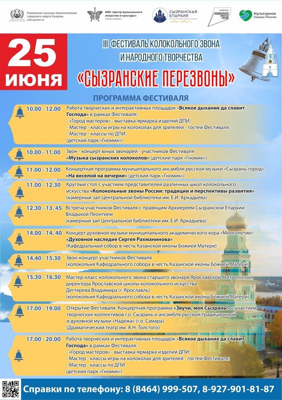 Сегодня в 10 часов в Сызрани начнется III фестиваль колокольного звона и народного творчества «Сызранские перезвоны». Он станет одним из мероприятий, проводимый в честь явления в Сызрани чудодейственной иконы Феодоровской Божьей Матери. Фестиваль пройдет на нескольких площадках Сызрани, а старт будет дан в парке Гномик. Здесь запланировано проведение мастер-классов, «Город мастеров», звон-концерт юных звонарей - участников фестиваля. В 11 часов начнется концертная программа коллектива «Сызрань город». В камерном зале центральной библиотеки имени Аркадьева состоится круглый стол, посвященный традициям и перспективам колокольного звона. В нем примут участие представители разных школ колокольного искусства. С участниками встретится правящий архиерей сызранской епархии владыка Леонтий.