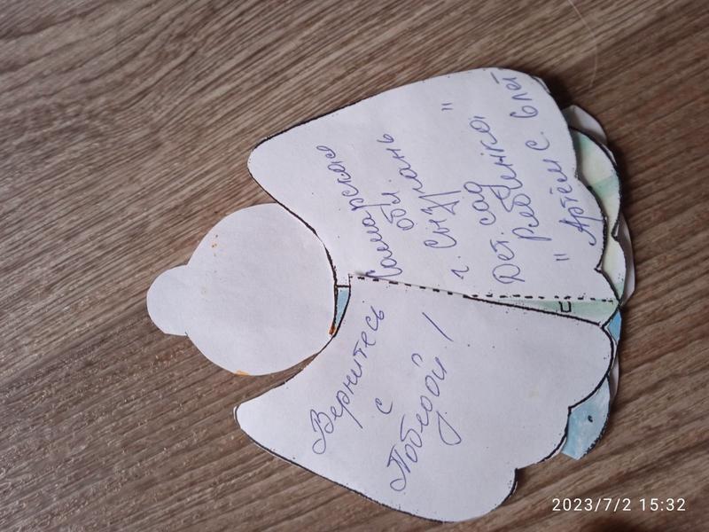 Трогательные подарки приготовили воспитанники детского сада «Рябинка» для раненых бойцов, проходящих лечение в сызранском госпитале. Малыши 4-5 лет раскрасили для бойцов маленьких бумажных ангелов - а взрослые помогли им написать добрые слова пожеланий на обороте. Впрочем, некоторые ребята, кто смог, написали свои имена на обороте. Обереги-послания для бойцов предложила сделать бывший педагог сызранской школы №12 и член Центра народных ремесел, Лина Игнатовна Денисова. Напомним, мастерица проводит в Сызрани фестиваль ДПИ «Краски лета». Большинство мероприятий проходит в районе улицы Декабристов.