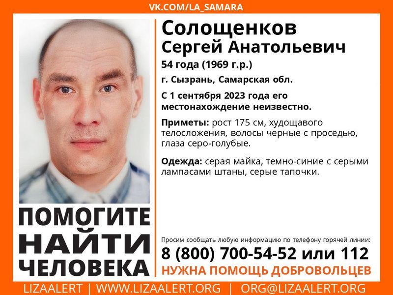 В сообществе добровольческого поискового отряда «Лиза Алерт» появилось сообщение о пропаже 54-летнего сызранца Солощенкова Сергея Анатольевича. С 1 сентября 2023 года его местонахождение неизвестно. При каких обстоятельствах пропал мужчина, не сообщается. Его приметы: рост 175 см, худощавого телосложения, волосы черные с проседью, глаза серо-голубые. На момент пропажи был одет в серую майку, темно-синие с серыми лампасами штаны, серые тапочки. Любую информацию, которая может помочь в поисках Солощенкова Сергея Анатольевича, можно направлять по телефону горячей лини отряда «Лиза Алерт»: 8 (800) 700-54-52 или 112.