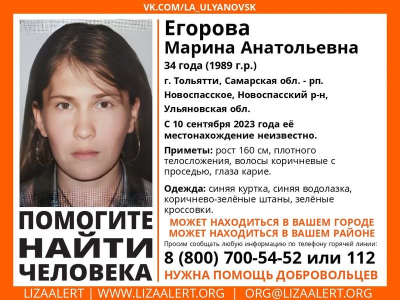 В сообществе поисковиков «Лиза Алерт» просят жителей Самарской области присмотреться к лицу 34-летней Егоровой Марины Анатольевны, пропавшей 10 сентября между Тольятти и поселком Новоспасское Ульяновской области. Как раз на пути между этими населенными пунктами находится и Сызрань, так что жителям нашего города также стоит проявить внимание - пропавшая может находиться и у нас, и не знать, что ее исчезновением обеспокоены не только родные, но и волонтеры двух областей. Приметы женщины: рост 160 см, плотного телосложения, волосы коричневые с проседью, глаза карие. Была одета в синюю куртку, синюю водолазка, коричнево-зеленые штаны, зеленые кроссовки. Все сведения о местонахождении Егоровой Марины Анатольевны принимает инфорг Юлия (Горячая) по телефону: 8-904-181-43-30.