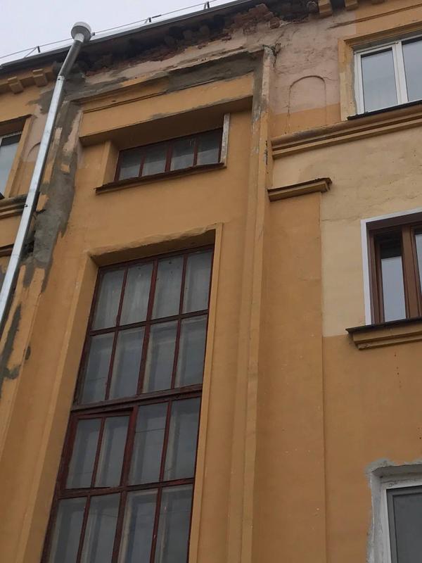 Не удивительно, что кладка стала разрушаться. Жильцы утверждают, что два десятка лет вода стекала по дырявой крыше на фасад дома. «Отсутствие дождевых сливов тому причина, штукатурка отслаивается по всему фасаду, а под самой крышей вода вымыла весь цемент в кирпичной кладке. Зимой образуется наледь в виде сосулек по три метра, которые и вытягивают кирпичи из кладки. Если не проводить кап. ремонт дома завтра он станет аварийным по бумагам, а по факту уже», - сообщает житель дома.