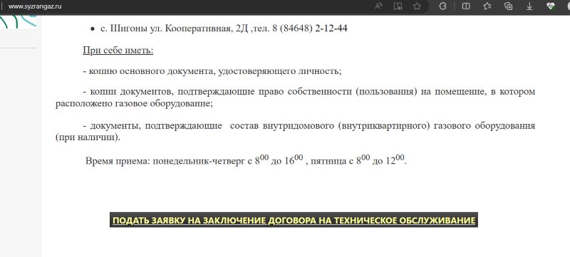 Теперь договор с ОАО «Сызраньгаз» можно перезаключить не только в офисе организации, но и на сайте. Об этом сообщает администрация Сызрани. Напомним, в связи с изменениями в Жилищный кодекс договоры на техническое обслуживание и ремонт газового оборудования в многоквартирных домах с ОАО «Сызраньгаз» должны быть перезаключены до 1 января 2024года: остается всего 13 дней. Оформить договор можно в офисах «Сызраньгаза» - их четыре, и, как сегодня стало известно, можно оформить его на сайте «Сызраньгаз» в разделе «Подать заявку о заключении договора на подключение».
