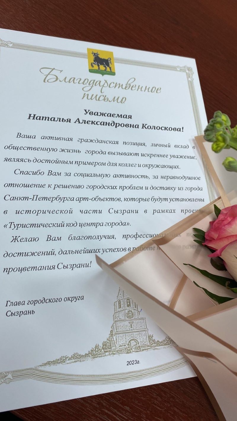 Вклад Натальи Колосковой в туристическое развитие отметил глава Сызрани Анатолий Лукиенко, вручив предпринимателю Благодарственное письмо.