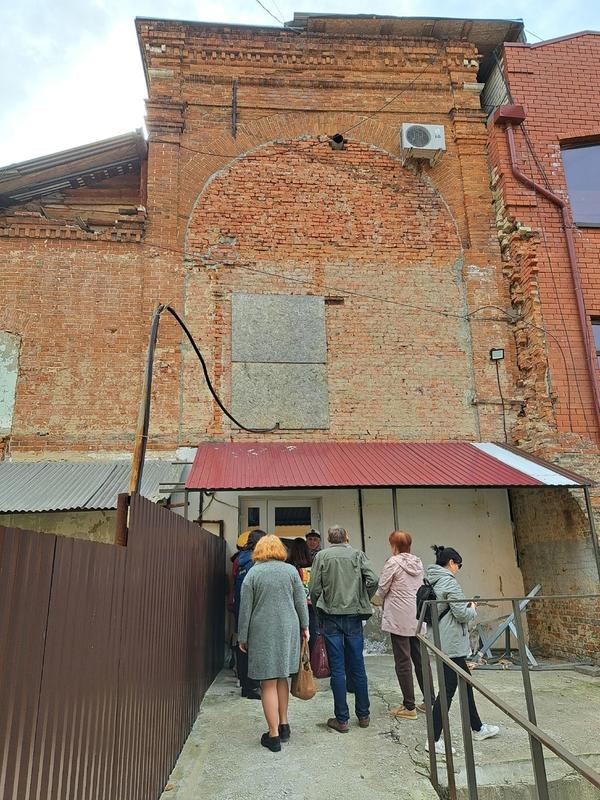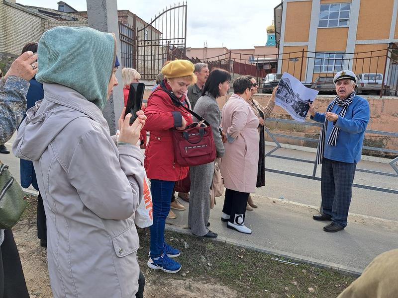 по центру Сызрани вместе с группой, экскурсовод увлеченно раскрывает