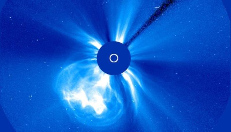 К Земле, как предполагают ученые, движется новый солнечный суперцентр. «Исключительно мощный солнечный взрыв, судя по всему, произошёл вчера на Солнце за его краем, на стороне, невидимой с Земли, - сообщает Лаборатория Солнца. - На поступивших изображениях отчётливо видно гигантское облако плазмы, одно из крупнейших за последние годы, выброшенное из-за юго-восточного края Солнца со скоростью не менее 1.5 тысяч километров в секунду. Кроме того, несмотря на почти полное экранирование солнечным диском, к Земле смогли пробиться потоки излучения, создавшие вспышку уровня M5.5, то есть всего в 2 раза более слабую, чем порог класса X. Можно лишь предполагать, какой мощности был полный взрыв», - предупреждают ученые.