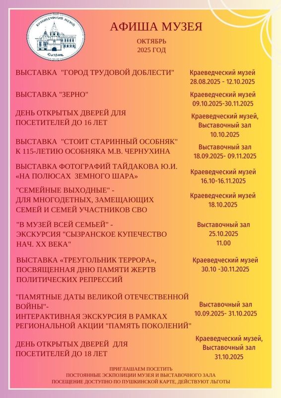 Напомним также, что с 9 октября в Краеведческом музее начнет работать выставка «Зерно», посвященная истории мукомольного дела в г. Сызрани. Выставка продлится до 30 ноября. А 10 октября в Краеведческом музее и Выставочном зале пройдет День открытых дверей для детей до 16 лет.