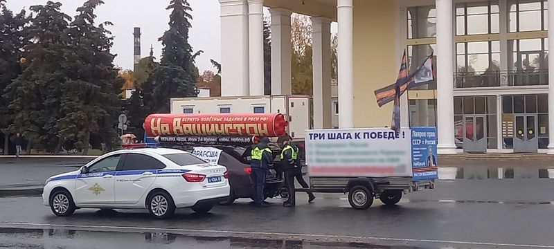 Автомобиль Hyundai, на крыше которого размещена бутафорская ракета, остановил в центре Сызрани патруль ГИБДД. На ракете - совсем не шуточная надпись «На Вашингтон»; иномарка везет прицеп с политическими лозунгами на борту, самый нейтральный из которых - признание суверенитета России, и номером телефона для сбора пожертвований «на ГСМ». Судя по опубликованным в сети фото, сотрудники ГИБДД провели беседу с водителем иномарки. В областном главке полиции пока не комментируют случившееся.