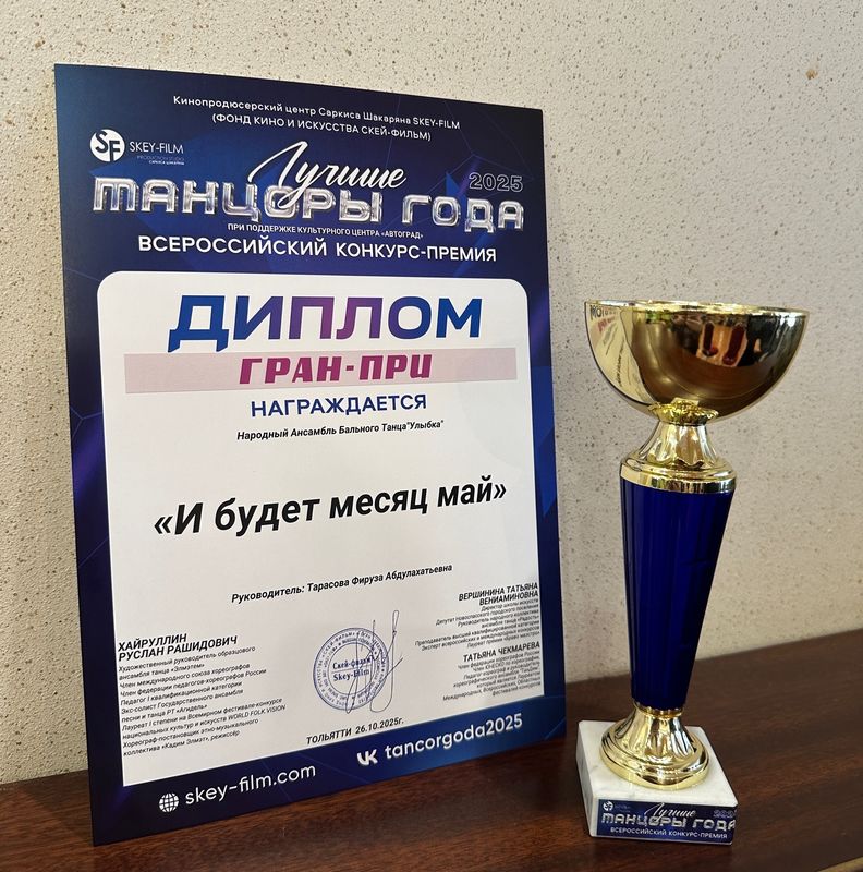 С блестящей победой вернулся народный ансамбль бального танца «Улыбка» со всероссийского конкурса лучших танцоров года «И будет месяц май». Конкурс прошел в культурном центре «Автоград» в Тольятти и собрал лучших мастеров танца. Знаменитый коллектив из Сызрани завоевал Гран-при конкурса. Кроме того, первые места достались парам за исполнение танцев, составляющих золотой репертуар ансамбля: Сергееву Михаилу и Ульяновой Еве за танец «На крыльях алых парусов», Александру Бейбулатову и Марии Барановой за Венский вальс.