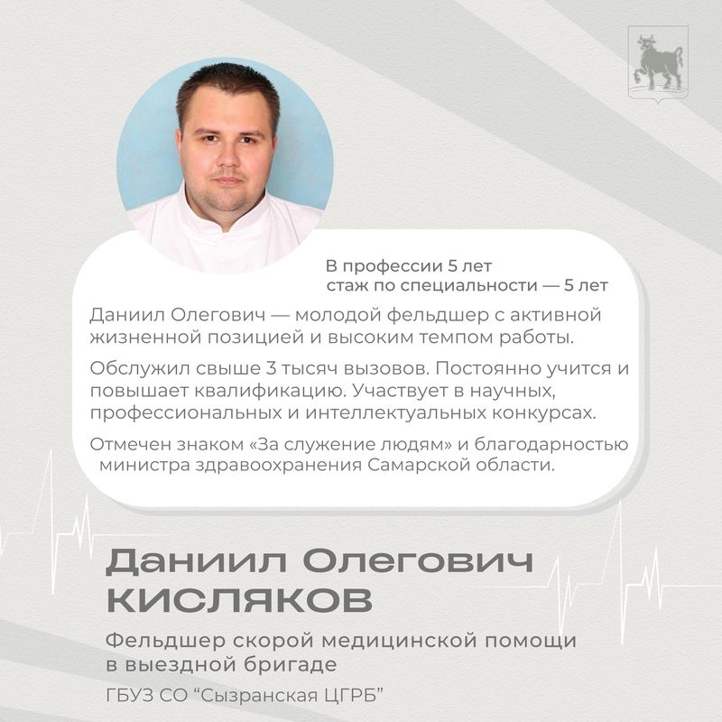 Отметим, что один из названных Валентиной сотрудников Скорой, фельдшер Даниил Кисляков, действительно, уважаемый в Сызрани медик - у молодого фельдшера высокий темп работы, он постоянно работает над собой, учится, участвует в научных и интеллектуальных конкурсах - и уже был отмечен Благодарностью министра здравоохранения Самарской области и почетным знаком За служение людям. В 2025 году коллеги выдвигали его кандидатуру на онлайн-голосование в конкурсе «Лучший работник здравоохранения городского округа Сызрань» в номинации «Молодость. Призвание. Талант» (средние медицинские работники).
