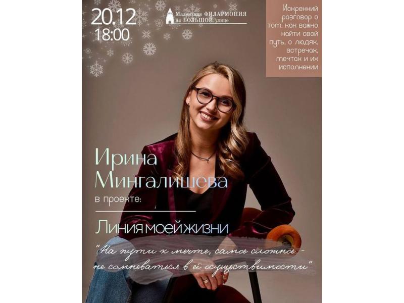 - «Линия моей жизни» (12+) - филармонический проект, созданный сразу же после открытия нашей музыкальной сцены. Проект посвящен уникальным людям нашего города, которые любят  и прославляют Сызрань. Наши гости - это всегда талантливые и созидательные личности. Такие встречи мы проводим не более двух в сезон. - отмечают организаторы. - В этот раз мы пригласили известную и в то же время многогранную личность Сызрани - Ирину Мингалишеву. Кто-то знает её как политика, кто-то - как директора культурно- досугового комплекса, а для многих она прежде всего - создатель танцевальной студии «Джокер», которую Ирина сумела вырастить в нашем городе с нуля.