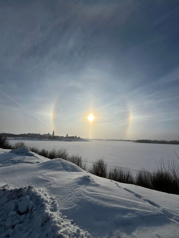 Уходя из Сызрани, морозы запустили утром на прощание салют: зажгли в небе морозное гало. Напомним, это эффектное, зрелищное природное явление. Светящийся нимб вокруг Солнца (или Луны) и яркий, как удар меча по небу, столб сверкающего света, возникает в морозные дни. Чтобы родилось гало, нужно, чтобы совпало несколько условий: 6-гранные кристаллики льда родились на высоте 5-10 км, плюс - мороз, плюс - лучи солнца, которые, преломляясь о кристаллы, рождают вокруг светила нимб. Жительница Сызрани сняла ледяную корону Солнца с пляжа «Мельница», а автор других фото, Стас, обратил внимание, как органично смотрится сверкающее в небе гало над куполом Казанского собора, бросая на центральную часть сызрани отблеск летающей в небе алмазной пыли.