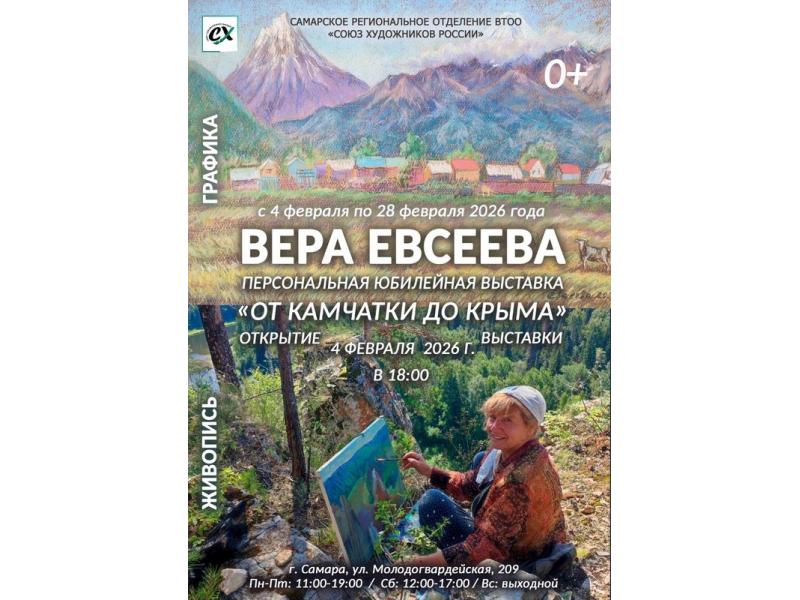 Жители и гости Самары увидят Камчатку, Крым, Россию такими, как их видит художник из Сызрани Вера Евсеева. Работы сызранской художницы Веры Евсеевой оценили по достоинству в правительстве Самарской области, а также - коллеги из самарского реготделения Союза художников России. Юбилейная выставка Веры Геннадьевны «От Камчатки до Крыма» откроется 4 февраля в выставочном зале реготделения в Самаре.