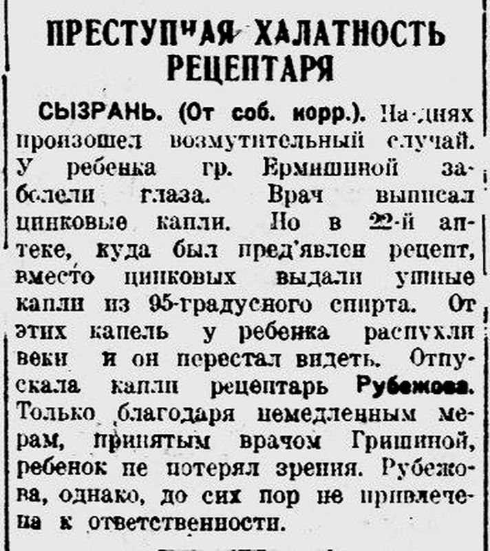 В Сызрани из-за халатности (или безграмотности) сотрудницы аптеки едва не ослеп ребенок. Возмутительный случай произошел в феврале 1936 года, он стал известен общественности благодаря публикации в газете "Волжская коммуна", а память об этой статье сохранил Telegram-канал «Вспомнить Сызрань». Халатность сотрудницы аптеки, действительно, можно назвать преступной: женщина едва не искалечила ребенка, лишив его зрения. У ребенка заболели глаза, мама отвела его к врачу, и тот выписал цинковые капли. Женщина обратилась с рецептом в аптеку - а рецептарь Рубежова выдала матери не глазные, а ушные капли на 95%-ном спирте. Ничего не подозревавшая женщина закапала ребенку в глаза практически чистый спирт с добавлением препаратов, вредных для глаз.