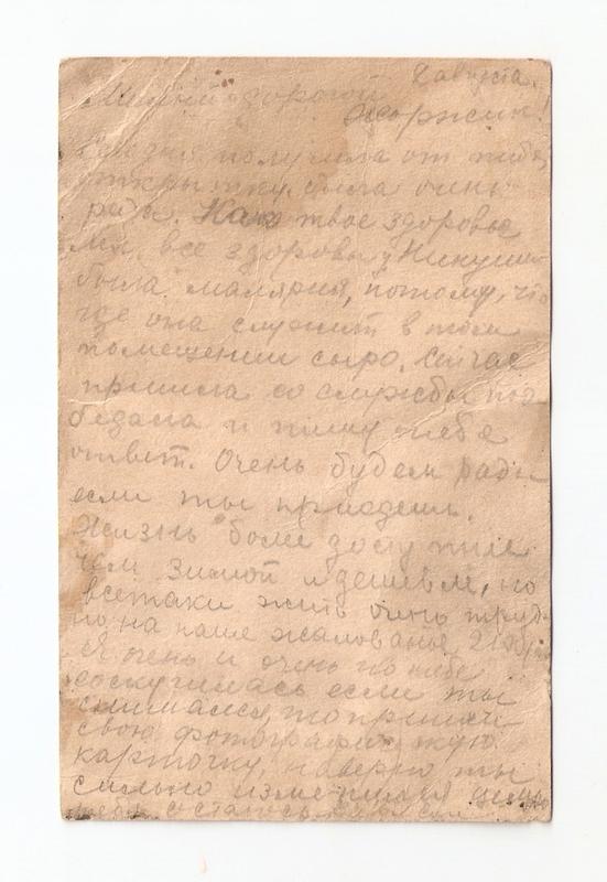 «Милый и дорогой Жоржик! Сегодня получила от тебя открытку. Была очень рада. Как твое здоровье? Мы все здоровы. У Нинуши была малярия, потому что (где) она служит, в том помещении сыро. Сейчас пришла со службы, пообедала и пишу тебе в ответ. Очень будем рады, если ты приедешь. Жизнь более доступнее, чем зимой и дешевле, но все-таки жить очень трудно на наше жалованье (2100 руб?). Я очень и очень по тебе соскучилась. Если ты снимался, то пришли свою фотографическую карточку. Наверное, ты сильно изменился. Целую тебя.